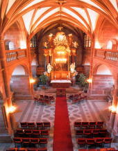 ファンタスティック街道を南へ下ると、なだらかな平原の中にひとつだけ緑のピラミッドの様な山が聳えたち、その頂にまるで天空に浮かぶようなお城がある。ノイシュバインシュタイン城と並ぶ新ゴシック様式のドイツの名城で、ドイツ最後の皇帝家一族が所有。チャペルは、皇帝の礼拝堂として使用されていたもので、堂内は荘厳で華麗な装飾。日本人の年間組数は、25組限定です。